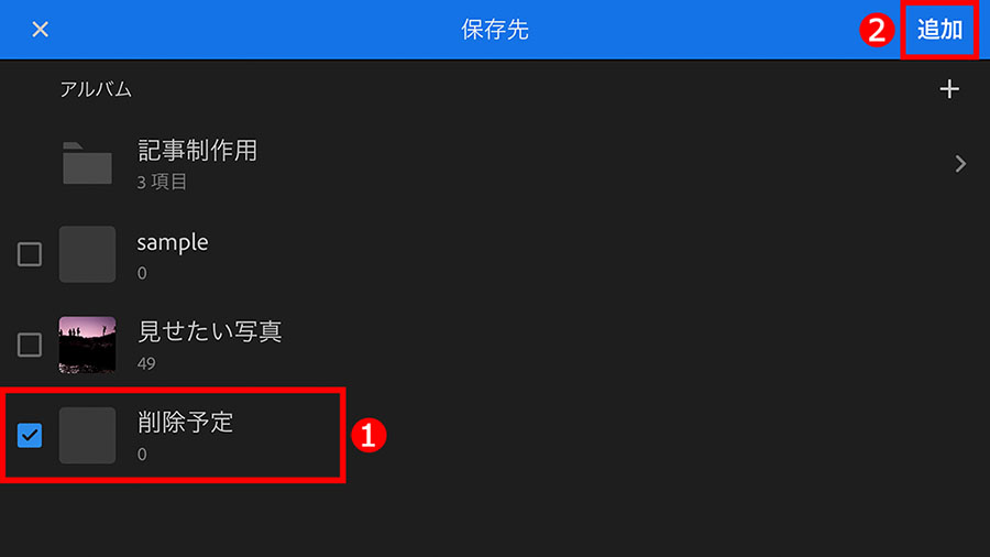 「保存先」の画面で、①「削除予定」アルバムをタップしてチェックを入れて、②「追加」をタップします。これで、「削除予定」アルバムに写真が追加できました。
