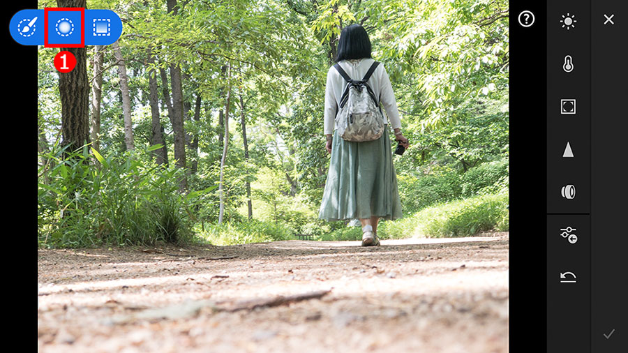 部分補正機能のタイプを選ぶ3つのアイコンが表示されました。この中から、①「円形フィルター」ボタンをタップして選択します。