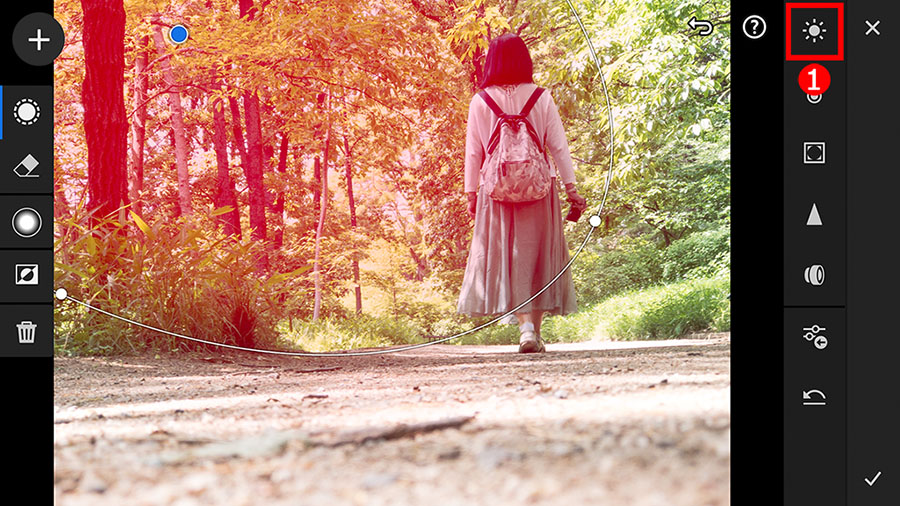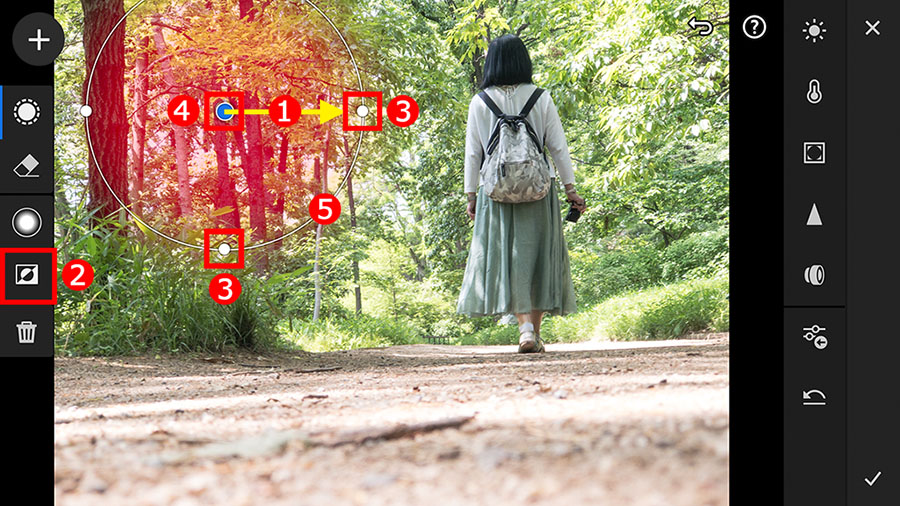 画面内を、①指でスワイプすると、円形状の丸い線と赤い模様が作られます。円が補正の範囲で、赤い部分が補正される強さの目安になります。範囲が分かりやすく色分けされているだけで、写真が赤くなるわけではありません。