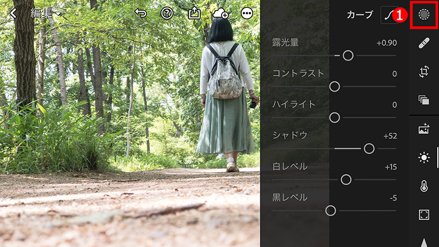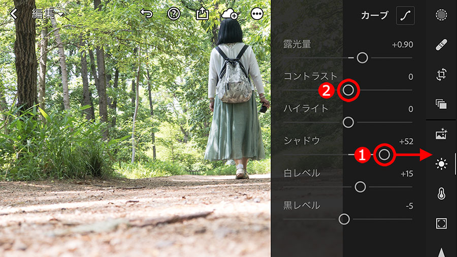 全体が少し明るい感じなので、①「ライト」ボタンをタップして、②「露光量」スライダーの補正量を少なくします。