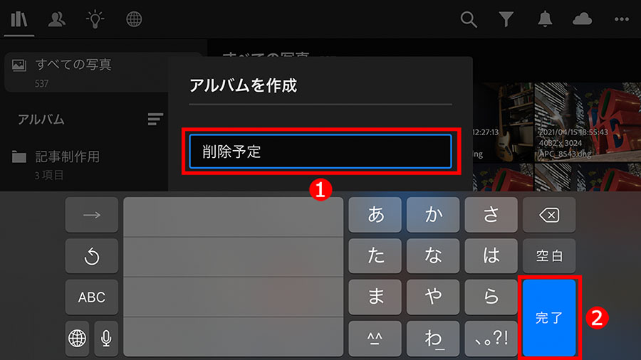 「アルバムを作成」画面が表示されるので、①「削除予定」と名称を入力して、②「完了」をタップします。これで、入力した名称のアルバムが作られます。