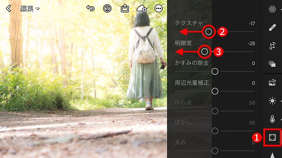 筆者は、少しかすんだような甘い描写が好みなので、①「効果」ボタンをタップして、②「テクスチャ」と、③「明瞭度」スライダーを左に移動し、ふわりとしたやわらかな質感にしてみました。