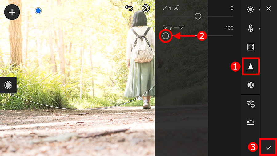 ①「ディテール」ボタンをタップしたら、②「シャープ」スライダーを左端まで移動し、「―100」に設定。調整ができたら、③のボタンをタップして、部分補正を確定します。