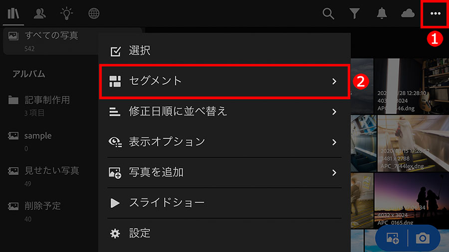 画面右上にある、①「・・・」ボタンをタップし、さらに、表示された一覧から、②「セグメント」をタップします。