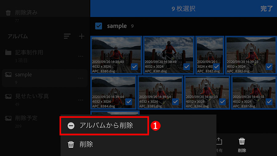 削除する方法が選択できるので、必ず、①「アルバムから削除」を選択します。続けて確認画面が出たら、「削除」を実行すれば作業は完了です。これで、アルバムの中から写真がなくなります。