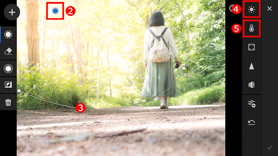 この写真では必要ありませんでしたが、「円形フィルター」の効果を微調整するときは、①「部分補正」ボタンをタップして、画面上に表示された、②「●」アイコンをタップします。