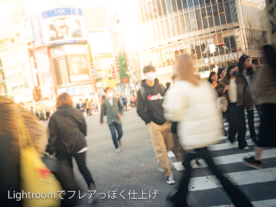 下は歩きながら撮影したのでブレている写真なのですが、フレアっぽく仕上げるだけで雰囲気が出るし、ブレた画質が味わいのある甘い描写に見えてくるから不思議です。