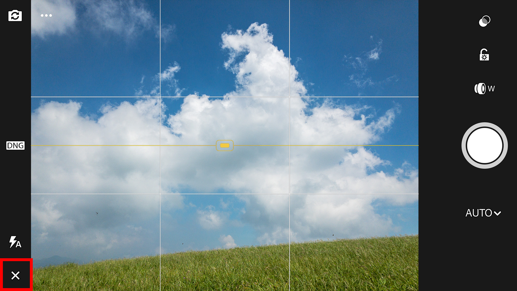 ちなみに、Lightroomのカメラなら、①画面左上の「・・・」ボタンをクリックして、②「グリッドとレベル」を選択すれば、三分割のグリッドが表示できます。撮影の目安にすると写しやすいかもしれません。