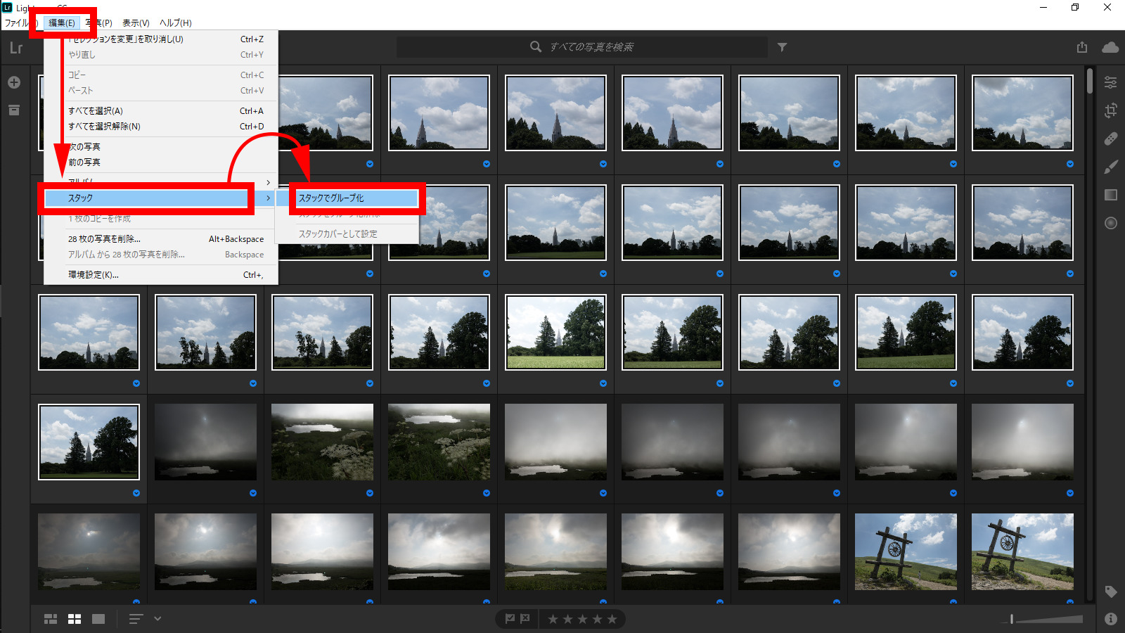 サムネールを選択したら、「編集」メニューの「スタック」→「スタックでグループ化」を選択します。