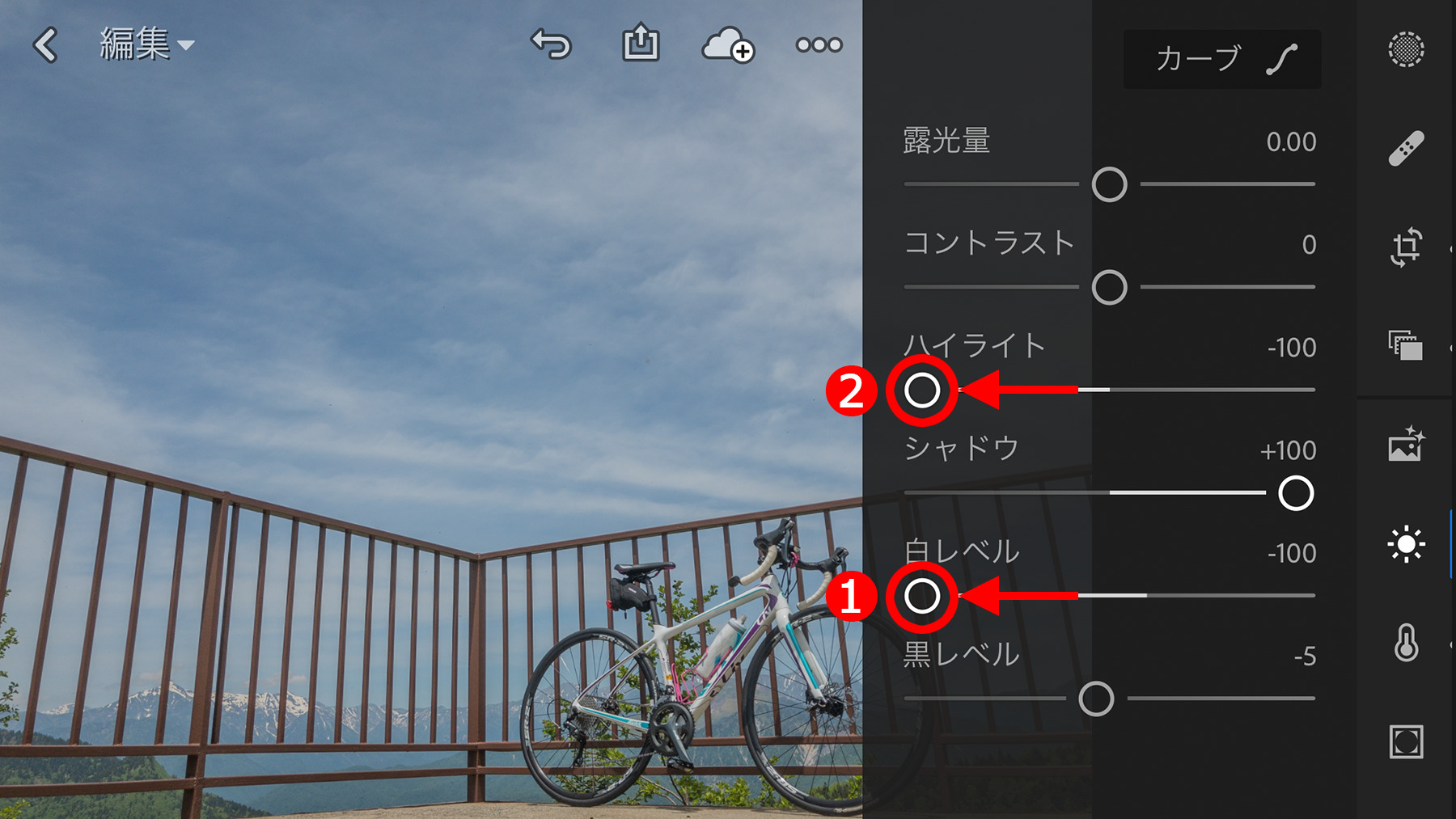 雲の濃淡を分かりやすくするために、①「白レベル」と②「ハイライト」スライダーを左に移動します。