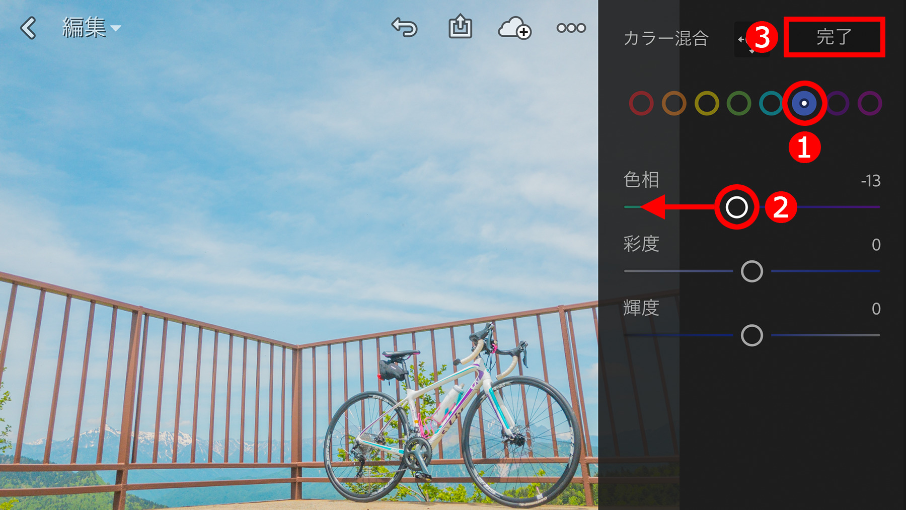 色の一覧から、調整する空の色の①「ブルー」をタップして選択します。写真によっては、左隣にあるシアンのほうが効果的なこともあるし、両方を調整したほうがきれいに仕上がることもあります。