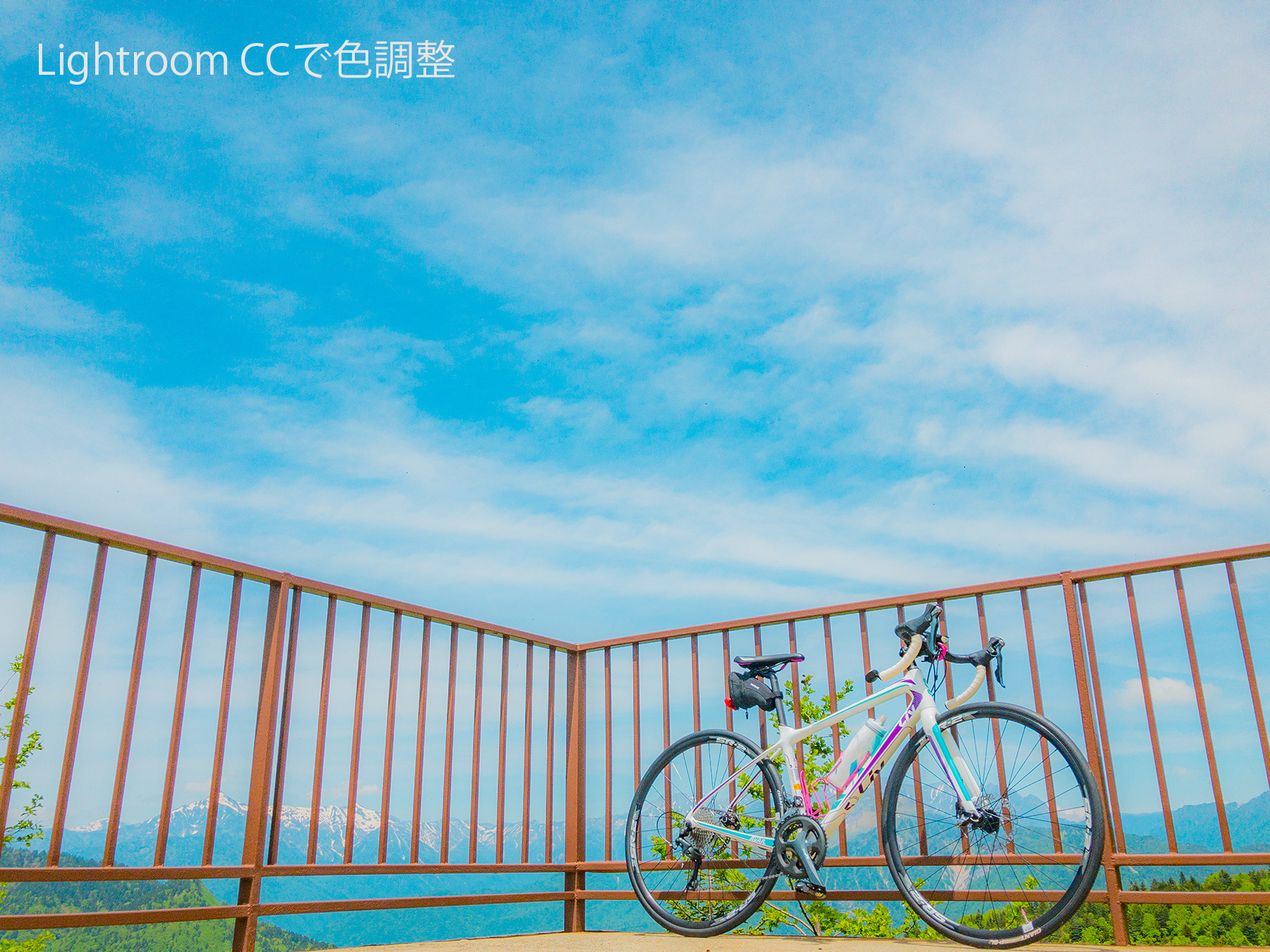最初は遠くの山並みを地表物にしたのですが、かすんで印象が薄かったため、もう少し明確なものをと思い、撮影の足に使っていた自転車を写し込みました。