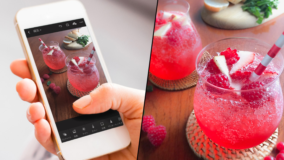 料理写真の魅力をさらにアップさせるための、かんたん撮影&補正術。今回は、色のついた炭酸系ドリンクをより美味しそうに見せるテクニックをご紹介します。ポイントは、色をしっかり鮮やかにし、明るくすること。無料のLightroomモバイル版を使って、手軽にチャレンジしてみましょう。