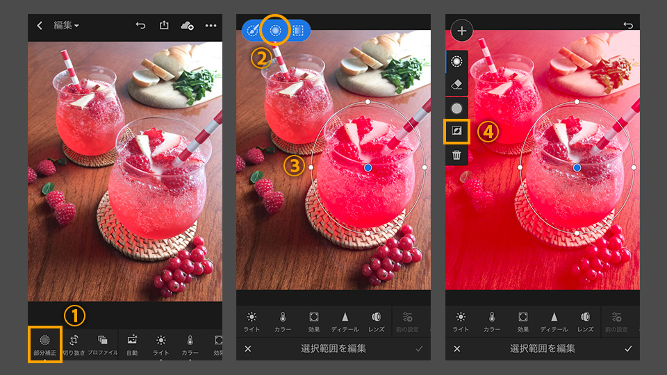 円形フィルターを使って、写真の部分的な補正を行なってみます。編集メニューの「部分補正」をタップます(①)。左上の「+」アイコンから円形フィルターアイコンをタップします(②)。写真の右側のドリンクをタップすると、円形フィルターの適用範囲が表示されます。ピンクでハイライトされた領域が、調整の対象領域となります。