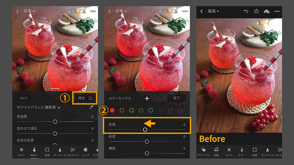 パネルの右上にある「混合」ボタンをタップし、カラーミックスのパネルに切り替えます(①)。カラーミックスは、写真内の特定の色範囲の色相、彩度、輝度を調整することができます。ここでは、一番左のレッドをタップし、「色相」のスライダーを「-5」まで左に動かします(②)。ドリンクに赤味が少し強くなりました。右上の「完了」をクリックします。