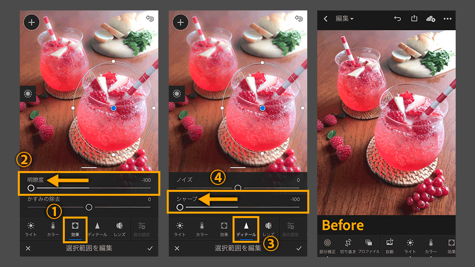 円形フィルターをした状態で、下の編集メニューから「効果」をタップします(①)。「明瞭度」のスライダーを「-100」まで左に動かします(②)。続いて、編集メニューから「ディテール」をタップし(③)、「シャープ」のスライダーを「-100」まで動かします(④)。フィルターを適用した部分がソフトな印象になり、マスクされた右側のドリンクが際立つようになりました。右下のチェックマークをタップして確定します。