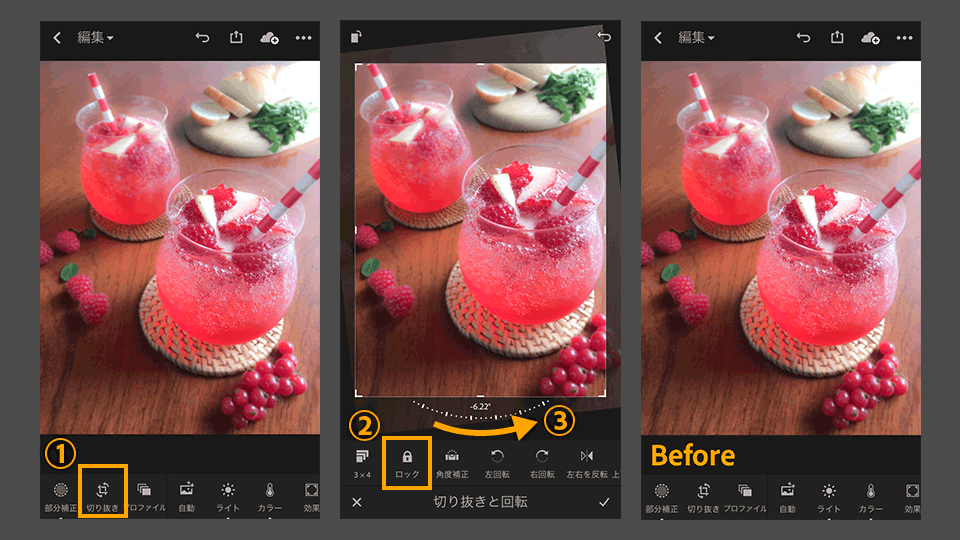 写真が少し傾いて見えるので、角度を調整しましょう。編集メニューから「切り抜き」をタップします(①)。オプションから「フリー」をタップして「ロック」の状態にし、写真の縦横比を固定します(②)。