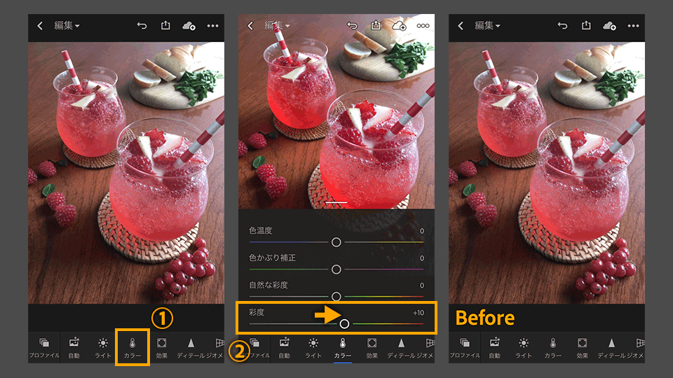 画面下の編集メニューから「カラー」をタップします(①)。パネルが表示されるので、その中の「彩度」を調整します。スライダーを右方向に移動し、彩度が「+10」になるようにします(②)。ドリンクの色の鮮やかさが増しました。
