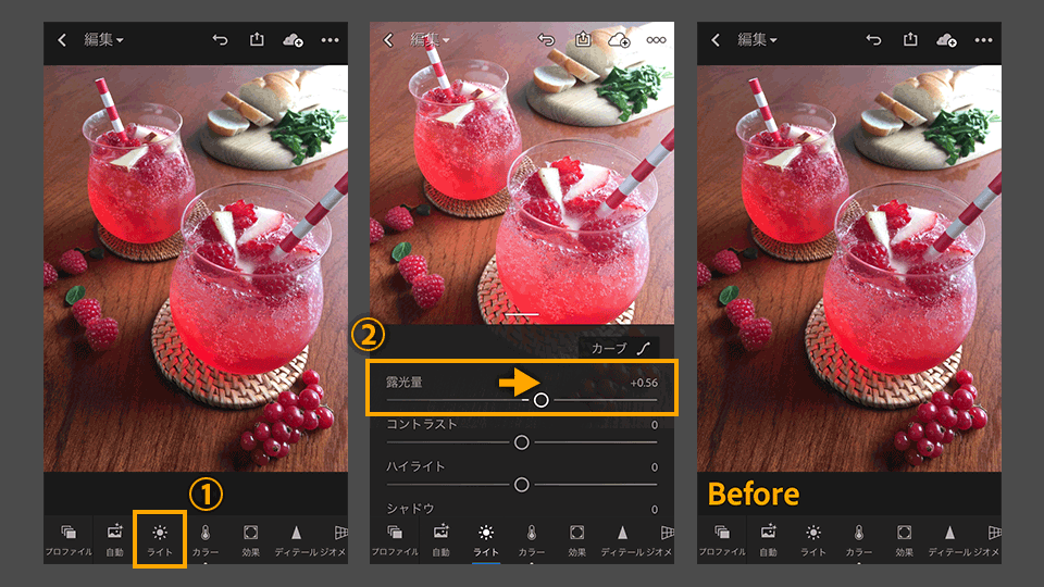 編集メニューから、今度は「ライト」をタップして、パネルを引き出します(①)。「露光量」のスライダーを「+0.56」まで動かし、写真全体を明るくします(②)。