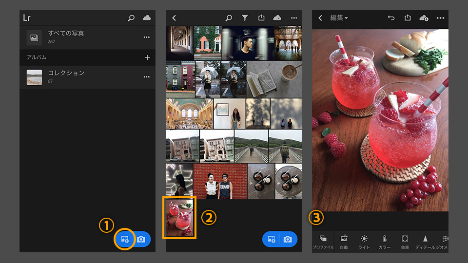 Lightroomモバイル版を起動するとまずこのような画面になります。ここではアルバムを作成し、写真をまとめて管理したり、写真をフォルダに分けて整理することができます。今回は、画面右下の読み込みボタンをクリックします(①)。カメラロールの画面に切り替わるので、保存した写真をタップすると(②)、Lightroomで写真が開きます(③)。