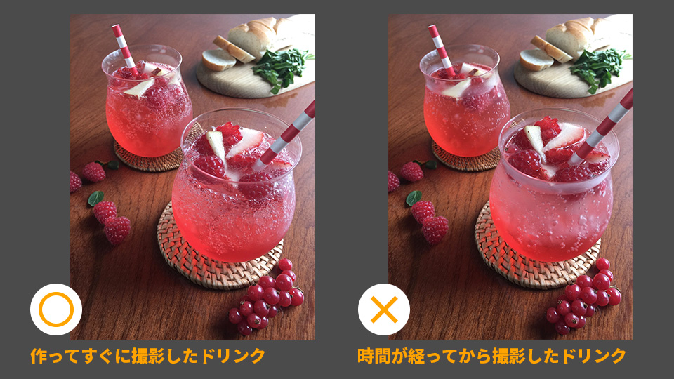 炭酸系ドリンクの写真は、シャッターを押す直前に炭酸を少量を加え、シュワシュワっとした感じが残っているときに撮影すると、躍動感やライブ感が増して、すぐに手に取り飲みたくなる印象を与えます。また、ドリンクができたら、すぐに撮影するのが重要。時間が経つと水滴がグラスに付いて、全体的に曇ってしまい、美味しさが伝わらなくなってしまいます。
