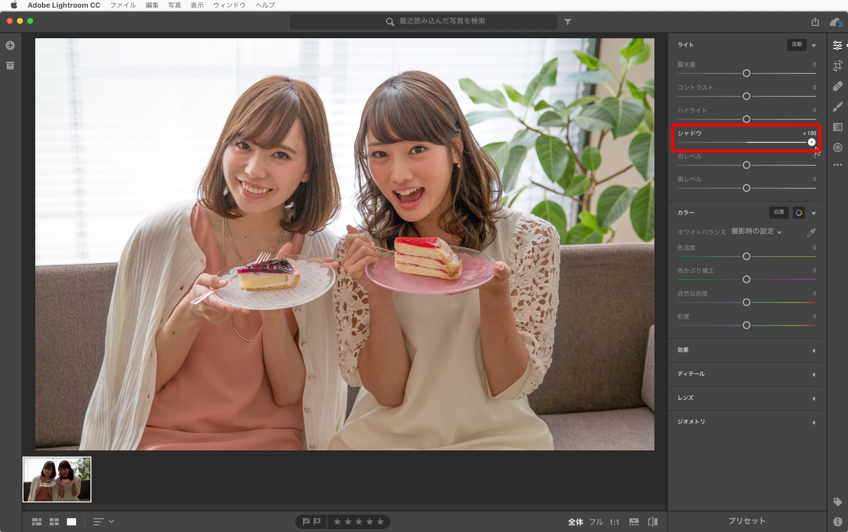 右側にある基本パネルの[編集]→[ライト]→[シャドウ]のスライダーを右にドラッグして調整します。