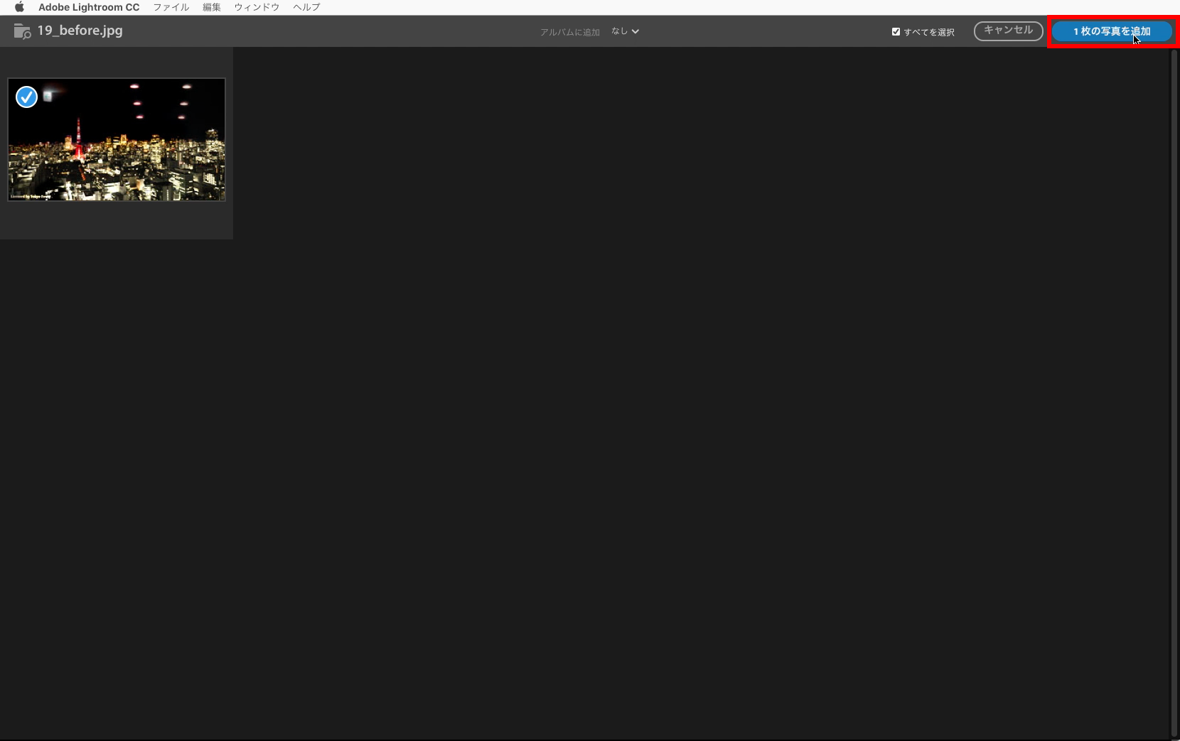 編集したい写真が選択できたら、右上にある[1枚の写真を追加]ボタンをクリックします。