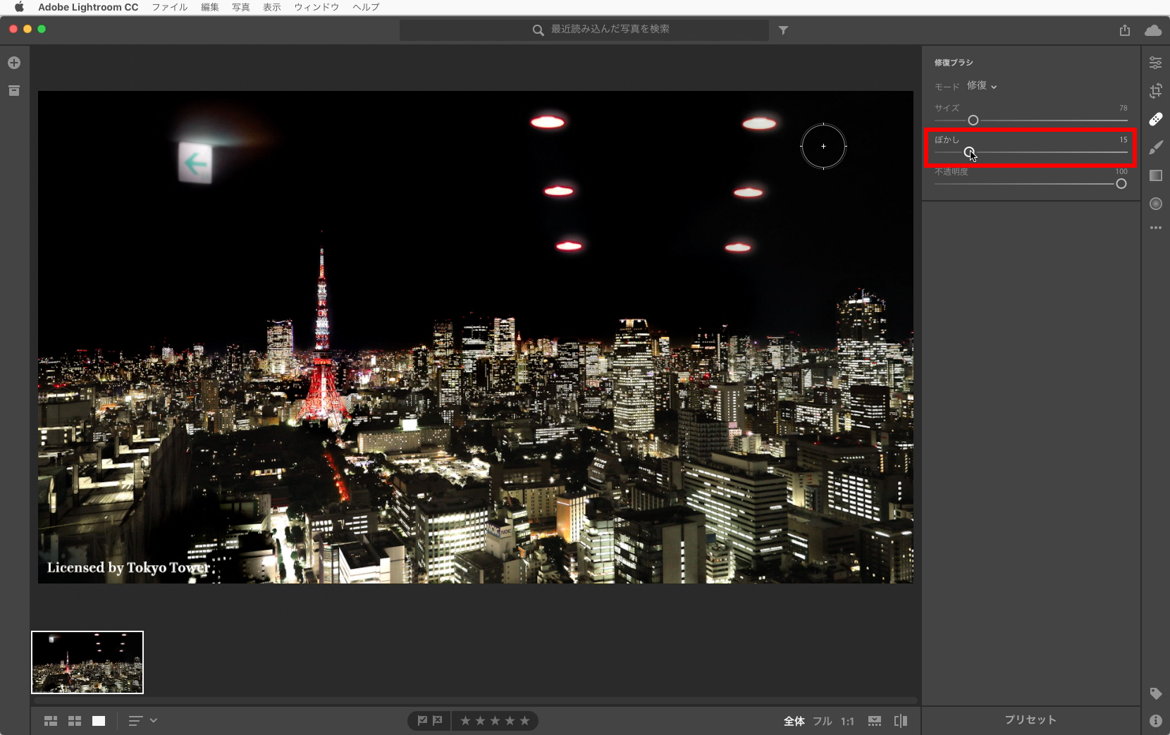 修復したい箇所にあわせてサイズ、ぼかしの値を設定します。