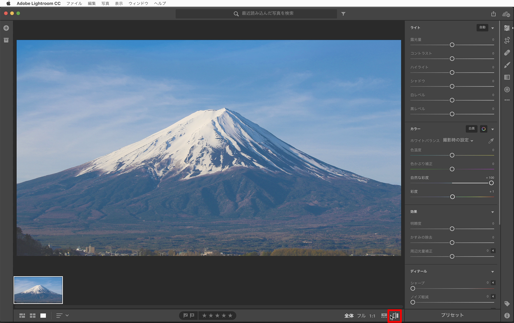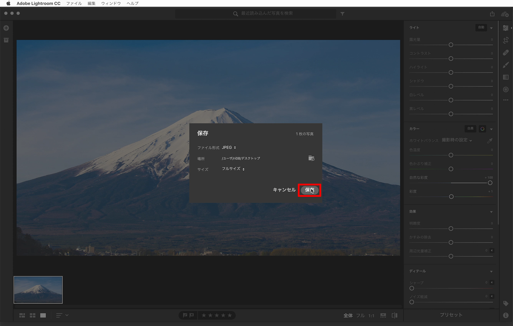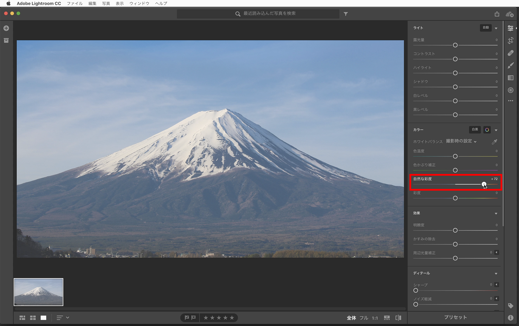 右パネルの[編集]→[カラー]→[自然な彩度]のスライダーを右にドラッグして調整します。