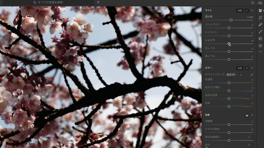 シャドウを調整することで、明るい部分に影響させずに暗い部分だけを補正することができます。