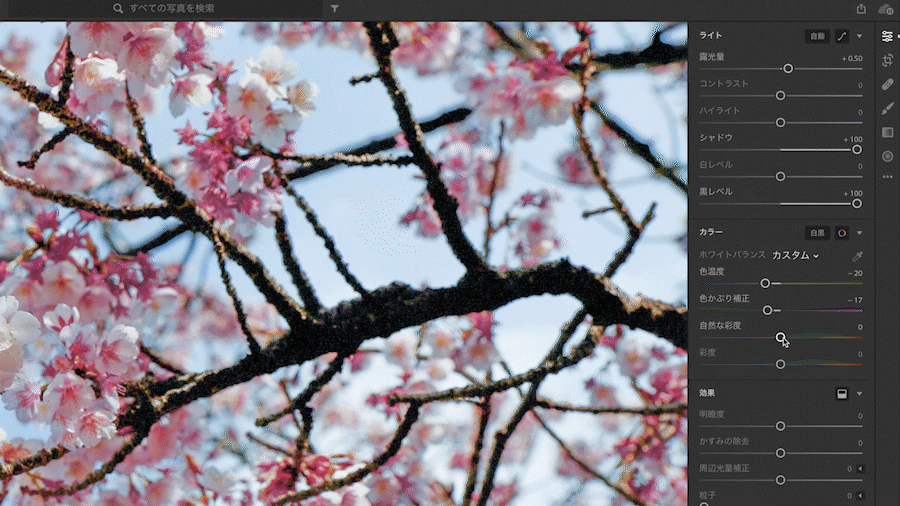 被写体と背景の互いの鮮やかさが思い通りに表現できなかった場合でも、Lightroom なら簡単な操作で理想の写真に仕上げることができます。