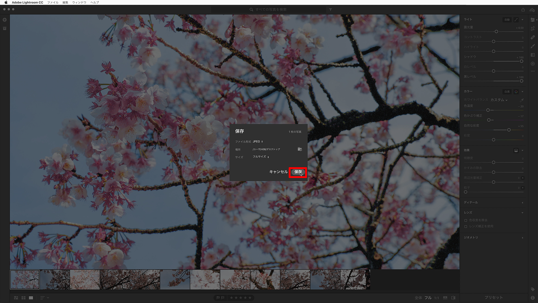 保存ダイアログボックスから、ファイル形式、場所、サイズを指定し、[保存]をクリックします。