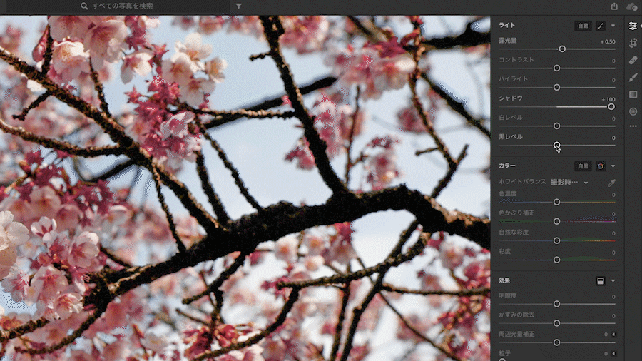 右パネルの[編集]→[ライト]→[黒レベル]のスライダーを右にドラッグして調整します。