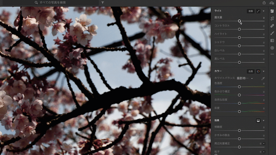 右パネルの[編集]→[ライト]→[露光量]のスライダーを右にドラッグして調整します。