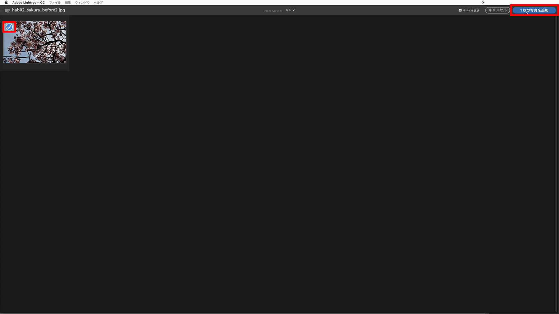 チェックマークがついていない場合は、サムネイルの左上をクリックすることで写真が選択され、青いチェックマークがつきます。