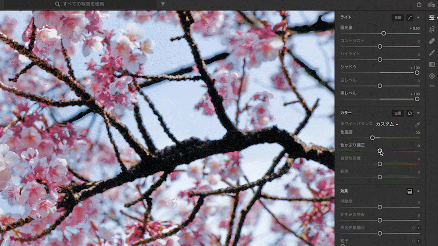 基本補正パネルの[色表現]→[色かぶり補正]のスライダーを左にドラッグして調整します。