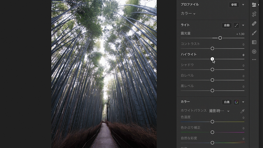 右パネルの[編集]→[ライト]→[ハイライト]のスライダーを左にドラッグ(マイナス)し、明るくなりすぎてしまった部分を抑えます。
