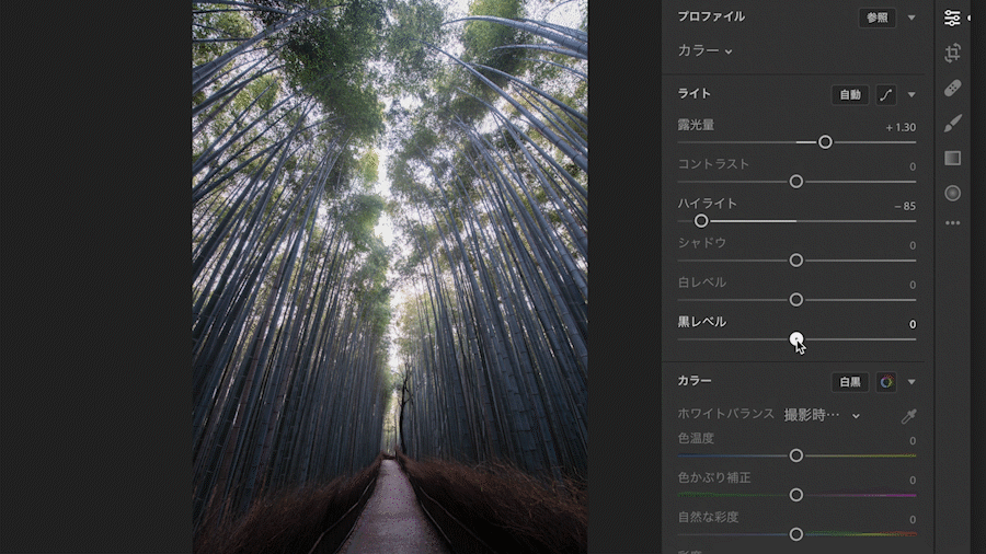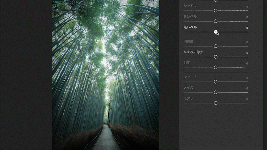 黒レベルとは画像の中でいちばん暗い部分のことで、スライダーを左にドラッグ(マイナス)するとさらに暗く、右にドラッグ(プラス)すると明るくなります。