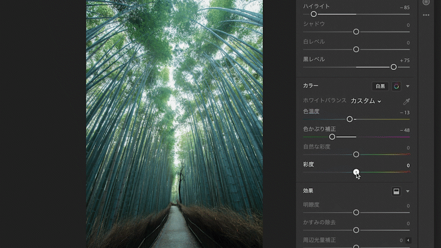 グリーンの色味が強くなりすぎてしまったので、少し彩度を落とすことで木々を自然な色にします。