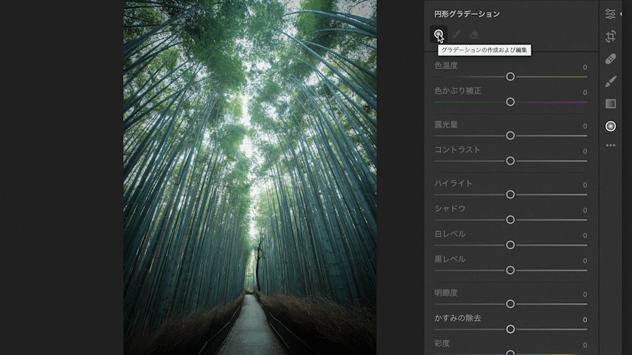 効果をつけたい位置の中心からドラッグして、効果を適用する範囲の円形グラデーションを作成します。