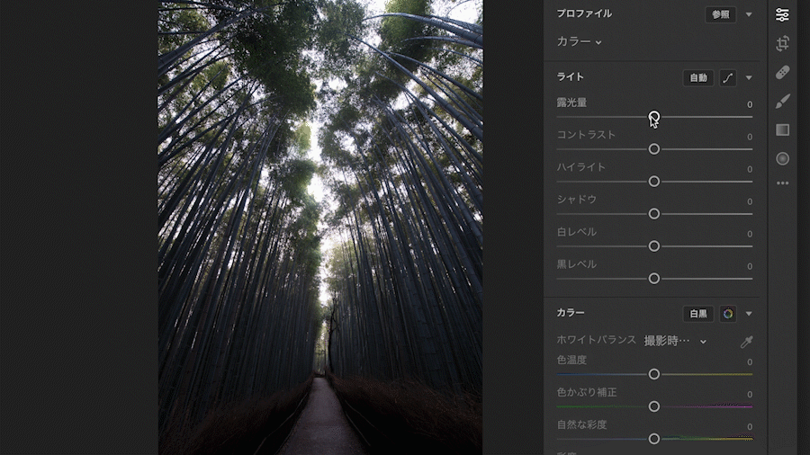 写真の雰囲気が暗いので、右パネルの[編集]→[ライト]→[露光量]のスライダーを右にドラッグして調整します。
