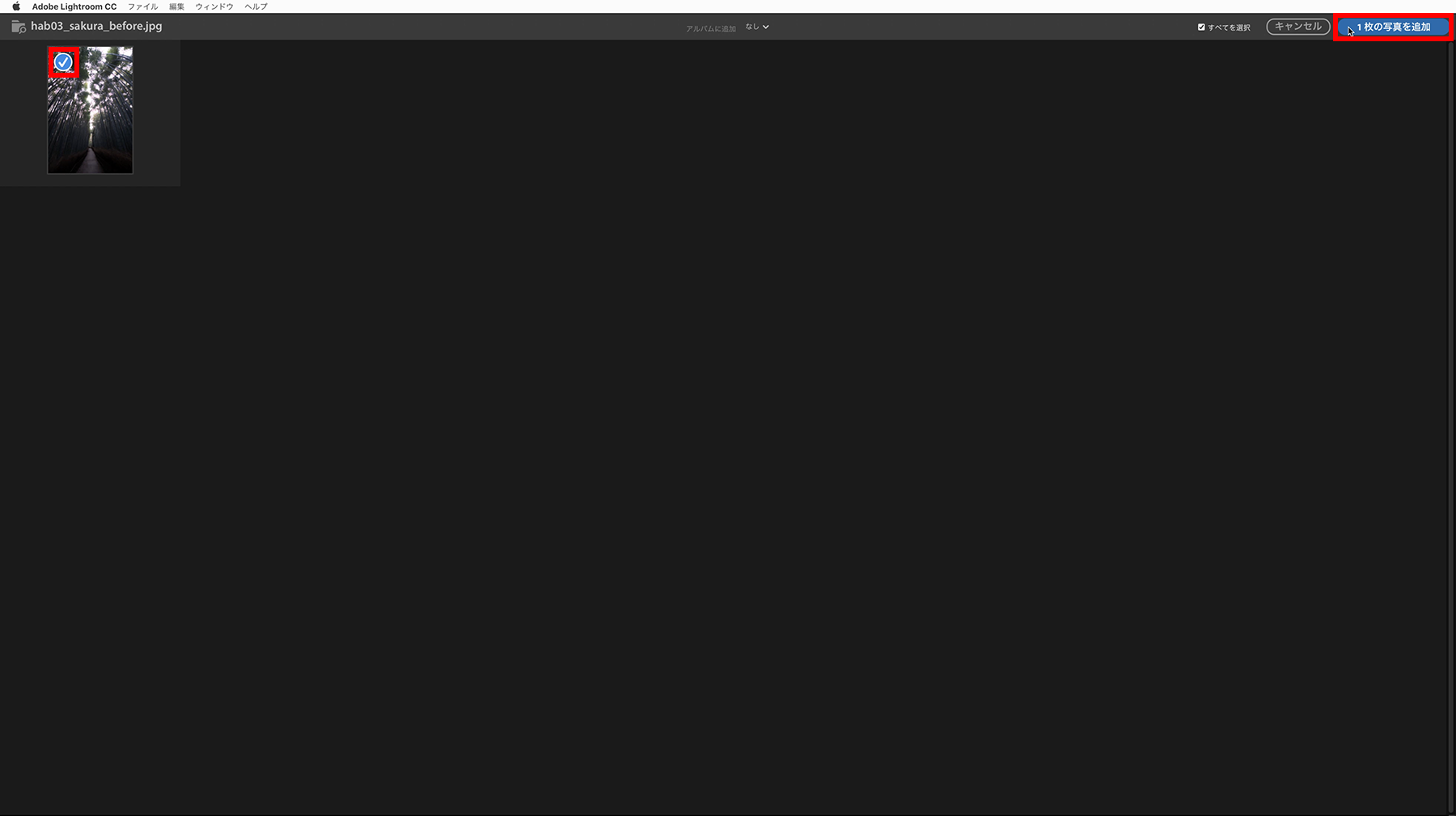編集したい写真が選択できたら、右上にある[1枚の写真を追加]ボタンをクリックします。