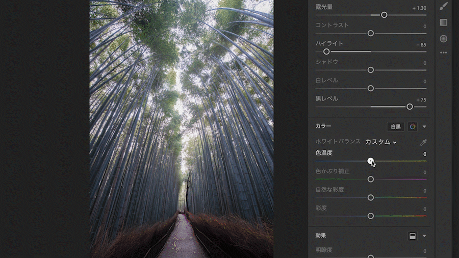 今回は、木々の青々しさを表現したいので色温度を寒色系に寄せます。