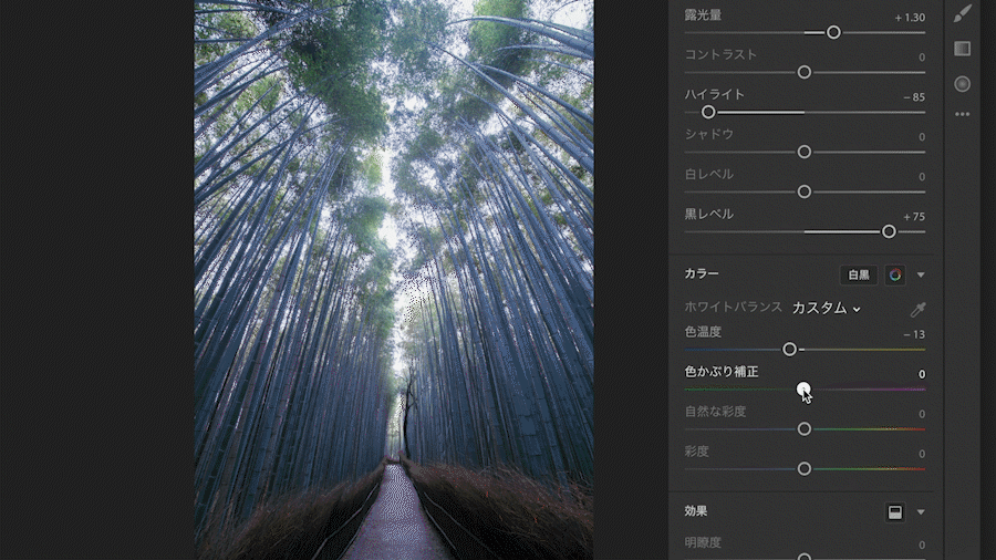 写真の雰囲気に合わせて、色かぶり補正を調整します。