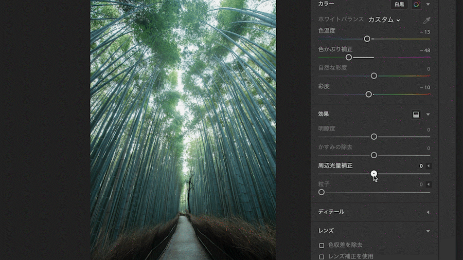 右パネルの[編集]→[カラー]→[色かぶり補正]のスライダーを左にドラッグして、実際に見たときの緑の鮮やかな印象に近づけます。