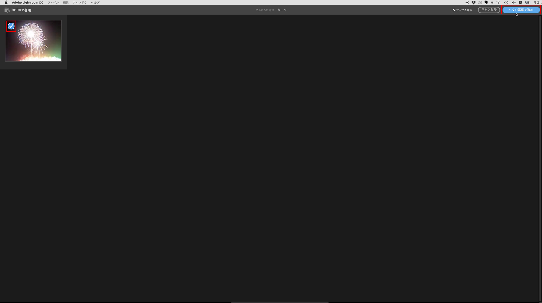 チェックマークがついていない場合は、サムネイルの左上をクリックすることで写真が選択され、青いチェックマークがつきます。
