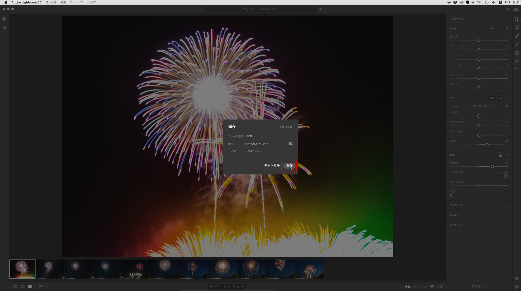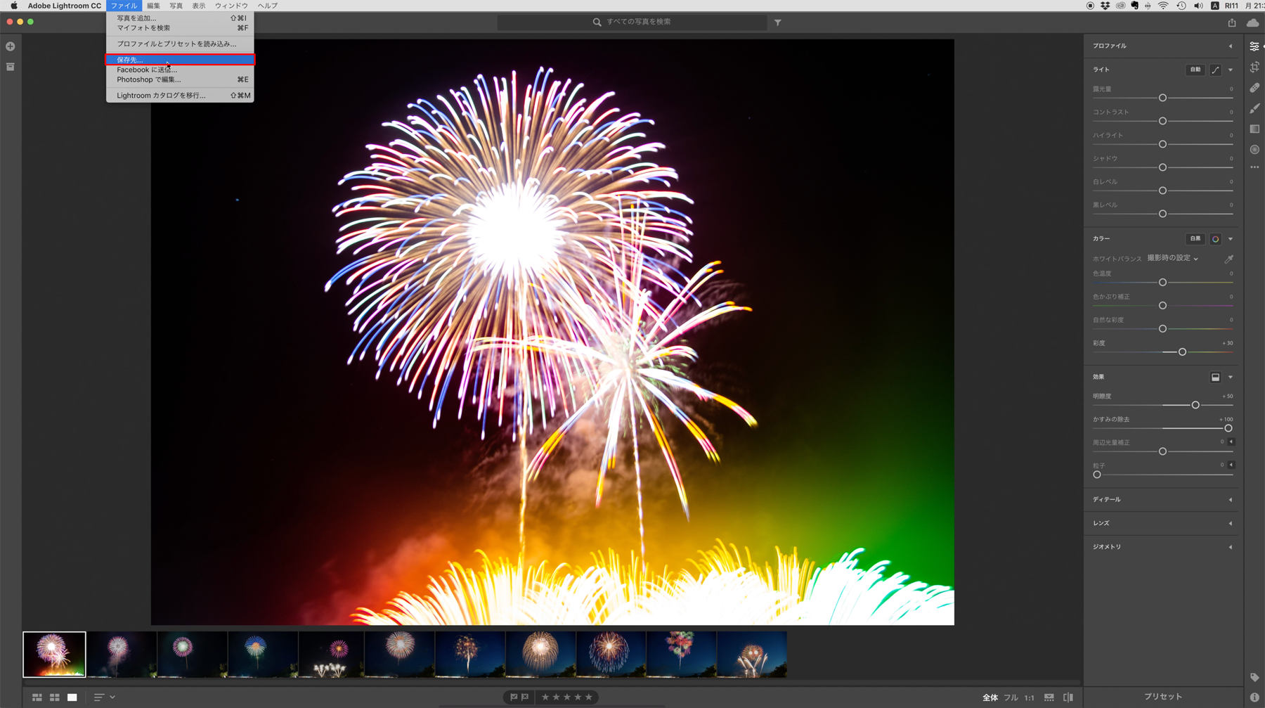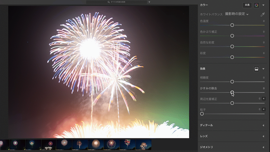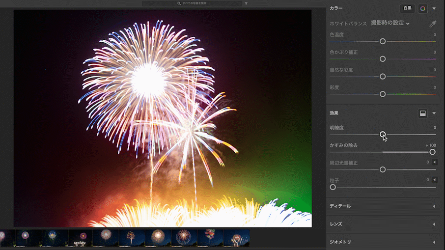まだ花火の煙のもやがかかっているので、明瞭度を調整してさらにはっきりとした写真にします。