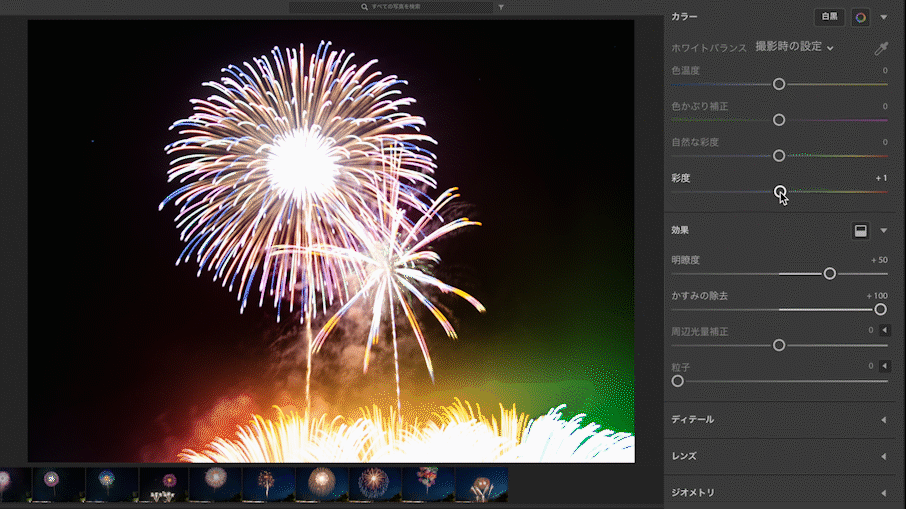 花火の色をより鮮やかにするために、右パネルの[カラー]→[彩度]のスライダーを右にドラッグして調整します。