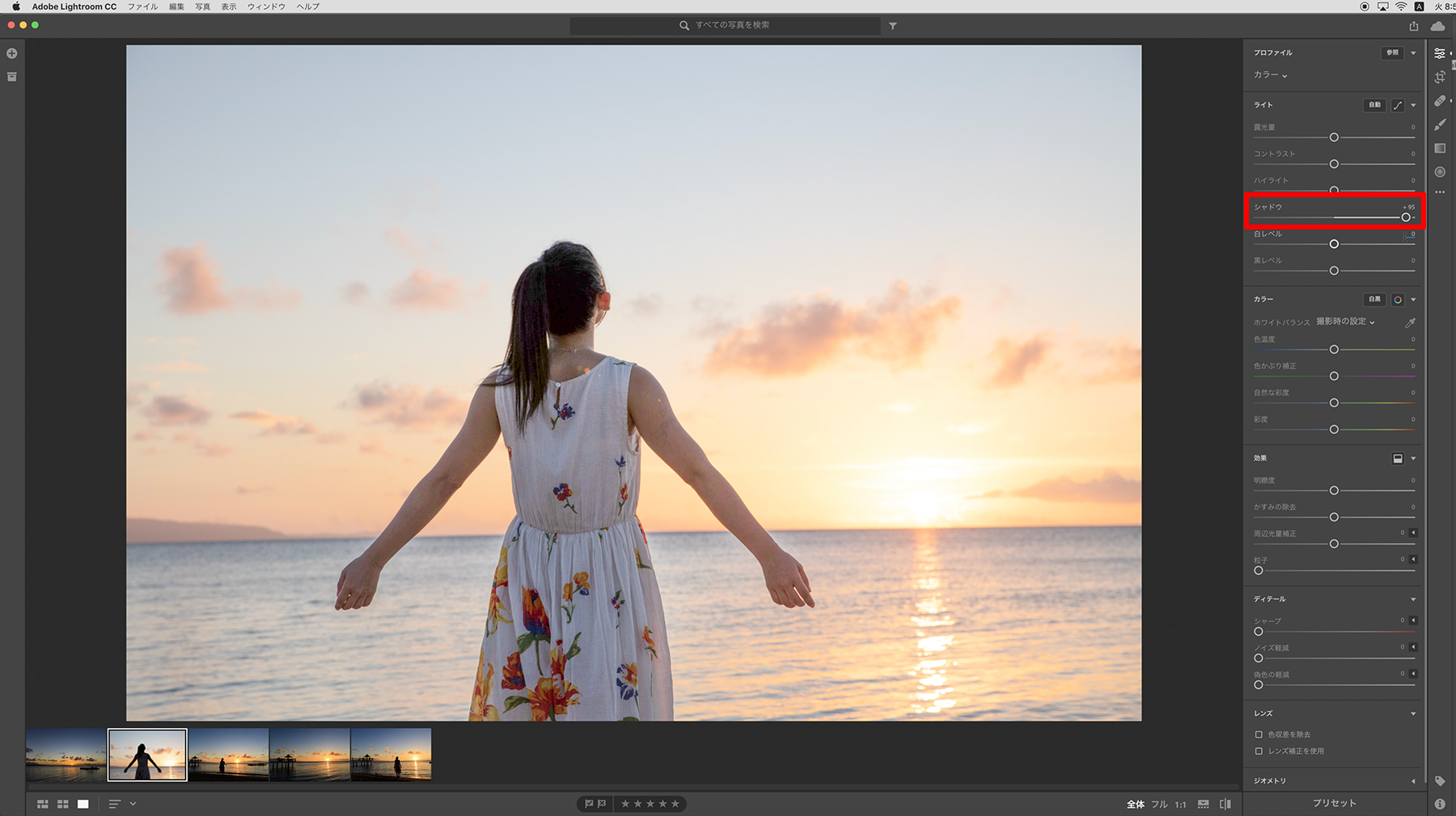 右パネルの[編集]をクリックし、[ライト]→[シャドウ]のスライダーを右にドラッグして調整します。