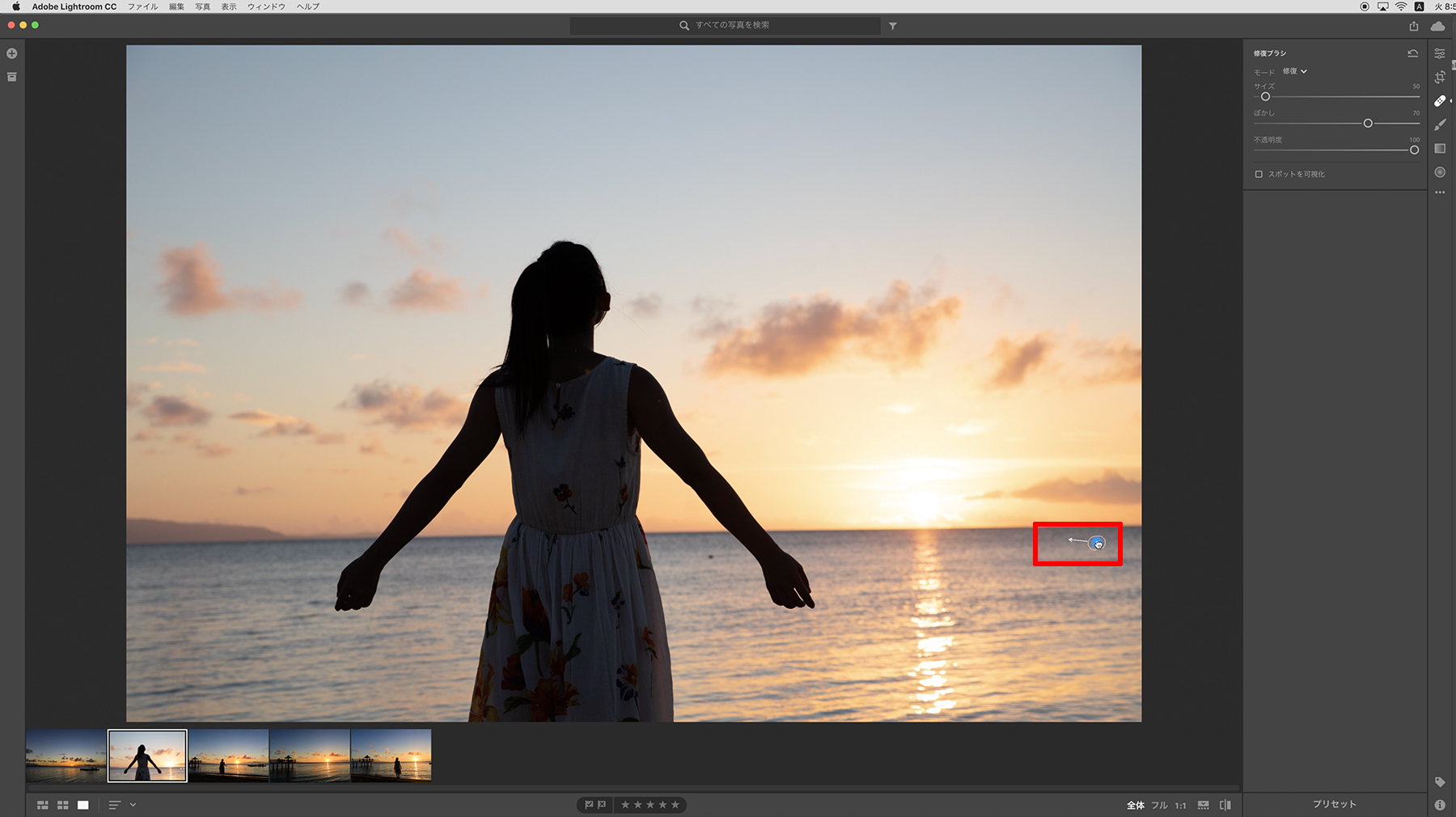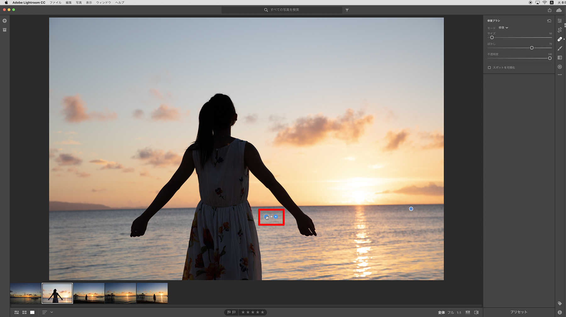 修復したい箇所をドラッグすると、Lightroomが修復したい箇所と似た箇所を探し出し、その部分を参照して修復を行います。